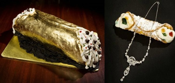 Cannoli este originar din Italia și tot acolo, chef-ul unui restaurant a decis să îl transforme într-o prețioasă bijuterie. Este un rulou umplut cu diferite sortimente de cremă de brânză, alături de alte dulciuri. Îmbrăcat în foiță de aur comestibilă, acesta este acompaniat de un colier cu diamante.